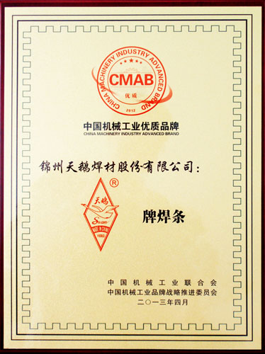 二O一三年四月十七日,在北京京西賓館召開的“全國機械工業(yè)品牌戰(zhàn)略推進工作會議”上,錦州天鵝焊材股份有限公司生產(chǎn)的“天鵝牌”電焊條產(chǎn)品榮獲“中國機械工業(yè)優(yōu)質(zhì)品牌”稱號。