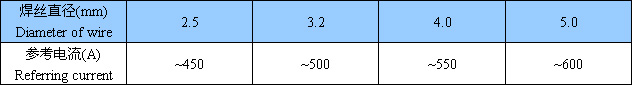 焊絲規(guī)格及參考電流:(AC或DC±)